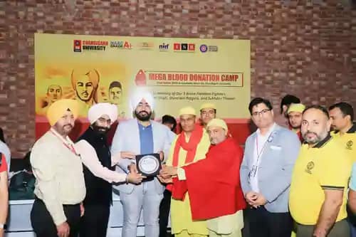 खरड़/घरूआँ 23 मार्च 2023। शहीद भगत सिंह, सुखदेव व राजगुरु के शहादत के उपलक्ष्य पर ट्राईसिटी के अस्पतालों में आई रक्त की कमी को पूरा करने के लिए मेगा रक्तदान शिविर का आयोजन किया गया। यह रक्तदान शिविर एनएसएस, विश्वास फाउंडेशन पंचकूला, रोटरी क्लब, खरड़ द्वारा संयुक्त रूप से मिलकर चंडीगढ़ यूनिवर्सिटी (Chandigarh University Ghaduan) के अकेडेमीक ब्लॉक डी 4 एवं ब्लॉक डी 5 में लगाया गया। इस रक्तदान शिविर में इंडियन रेडक्रॉस सोसाइटी जिला शाखा मोहाली ने एहम भूमिका निभाई।