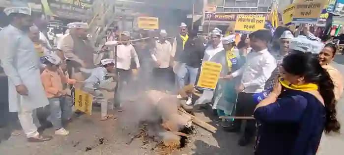 सिरसा। (सतीश बंसल) आम आदमी पार्टी द्वारा सरपंचों पर हुए लाठीचार्ज (Protest) व 4 हजार सरपंचों पर दर्ज किए गए मुकदमों के विरोध में मुख्यमंत्री मनोहर लाल खट्टर व उप मुख्यमंत्री दुष्यंत चौटाला का पुतला फूंककर विरोध प्रकट किया। आम आदमी पार्टी के कार्यकर्ता बड़ी संख्या में टाऊन पार्क में एकत्रित हुए और वहां से जुलूस की शक्ल में नारेबाजी करते हुए सुभाष चौक पर पहुंचे।