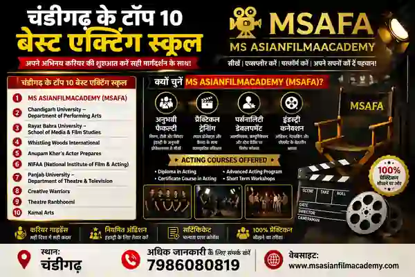 चंडीगढ़ के इन टॉप स्कूल्स में MSAFA (MS Asian Film Academy) एक बेहतरीन विकल्प है, जो अपनी एक्सपर्ट फैकल्टी, समग्र कोर्सेस, और वास्तविक एक्टिंग स्किल्स पर ध्यान केंद्रित करता है। चाहे आप फिल्मों में काम करना चाहते हों, टीवी शो में एक्टिंग करना चाहते हों या थिएटर में अपना करियर बनाना चाहते हों, यह एकेडमी आपको बेस्ट ट्रेनिंग प्रदान करती है।