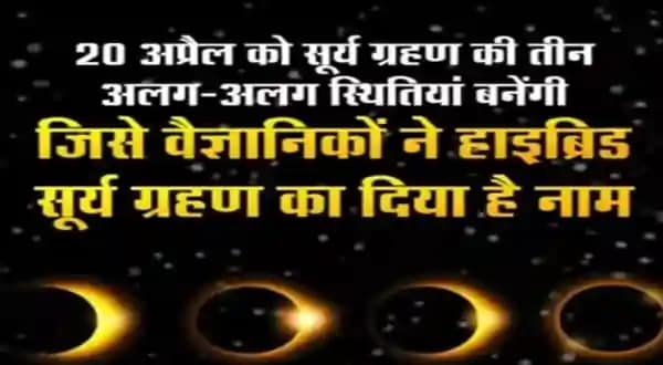 Solar Eclipse 2023: 20 अप्रैल को 100 साल बाद सूर्य ग्रहण लग रहा है, यह अपनी तरह का एक अद्भुत नजारा होगा! इस दिन सूर्य ग्रहण की 3 तरह की स्थितियां दिखेंगी. इस हाइब्रिड सूर्य ग्रहण कहा जाता है! ग्रहण के दौरान सूर्य कभी कुंडलियां कभी आशिक और कभी पूर्ण ग्रहण के रूप में दिखेगा ! इस दौरान रिंग ऑफ फायर बनेगी 20 अप्रैल की अमावस्या को लगने वाला सूर्य ग्रहण भारत में नहीं दिखेगा , परंतु यह राशियों पर असर अवश्य करेगा यह ग्रहण सुबह 7:04 से दोपहर 12:29 तक रहेगा !