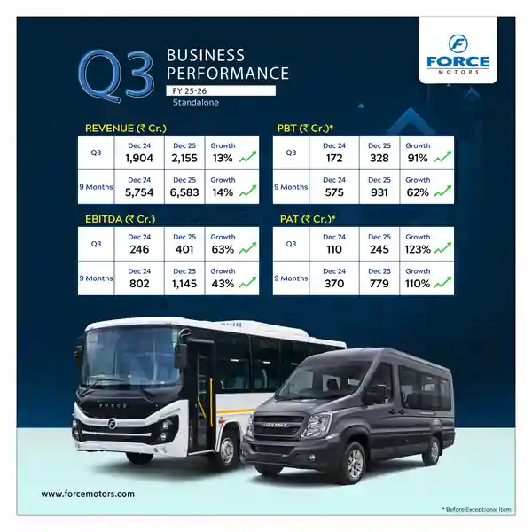 इंदौर, फरवरी, 2026: Force Motors लिमिटेड, जो कि भारत की सबसे बड़ी वैन निर्माता और शेयर्ड तथा विशेष मोबिलिटी समाधानों में प्रमुख कंपनी है, ने आज 31 दिसंबर, 2025 को समाप्त तिमाही (वित्त वर्ष 2025-26 की तीसरी तिमाही) के अपने वित्तीय परिणामों की घोषणा की।