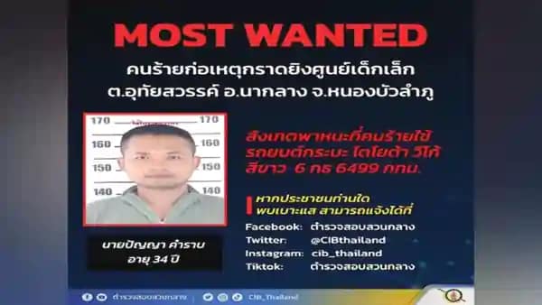 थाईलैंड की केंद्रीय जांच पुलिस ने एक बयान में कहा- बच्चे के केंद्र में शूटिंग में हमलावर 34 वर्षीय पन्या खमरब का हम पीछा कर रहें हैं। थाईलैंड की केंद्रीय जांच पुलिस (सीआईपी) के अनुसार, एक सफेद टोयोटा वीगो पिकअप ट्रक पंजीकृत 6 कोर 6499, बैंकॉक, अपराधी द्वारा इस्तेमाल किया गया था।