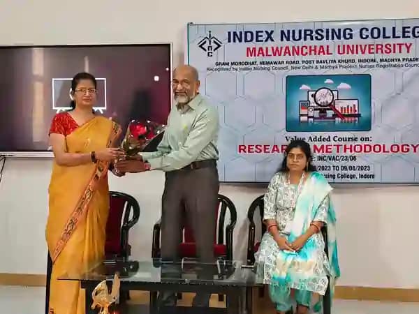 इंदौर। इंडेक्स नर्सिंग कॉलेज, मालवांचल यूनिवर्सिटी द्वारा अनुसंधान पद्धति विषय पर विशेष कोर्स का आयोजन इंडेक्स और अमलतास ग्रुप के चेयरमेन श्री सुरेश सिंह भदौरिया के नेतृत्व में हुआ व प्राचार्या डॉ. स्मृति जी. सोलोमन के मार्गदर्शन में किया गया । मुख्य अथिति के रूप में मालवांचल विश्वविद्यालय के अनुसंधान डीन एवं विभागाध्यक्ष आर्थोपेडिक्स, डॉ. मुस्तफा जौहर थे उन्होने अनुसंधान पद्धति के महत्व के बारे में बताया साथ ही अनुसंधान पद्धति का सही तरीके से उपयोग करना जिस से उसका सही उपयोग हो सके और कभी-कभी सही अनुसंधान पद्धति का सही तरीके से उपयोग नहीं होता है, तो उसका कुछ अलग परिणाम निकल आता है ।(English)
