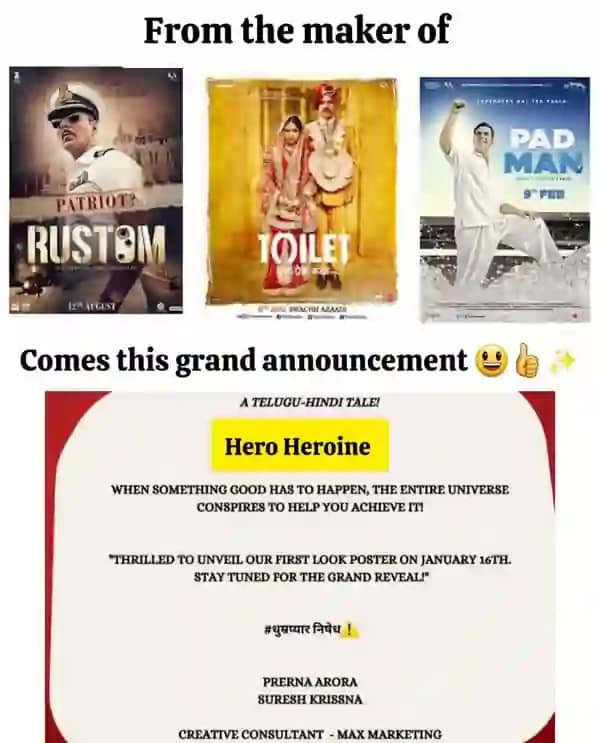 एक प्रसिद्ध उद्धरण है: “जब कुछ अच्छा होना होता है, तो पूरा ब्रह्मांड उसे हासिल करने में आपकी मदद करने की साजिश करता है।” ठीक इसी तरह हीरो हीरोइन प्रोजेक्ट अस्तित्व में आया। कुछ महीने पहले चेन्नई में एक सुबह एक होटल लॉबी में प्रेरणा से एक आकस्मिक मुलाकात के दौरान, जहां वह एक संगीत वीडियो एल्बम के लिए मौजूद थी, मैंने एक कप कॉफी के दौरान उसके साथ दो मिनट की एक छोटी सी कहानी साझा की। प्रेरणा (Prerna Arora) ने अपनी तीव्र बुद्धि से इस विचार को उत्साहपूर्वक स्वीकार किया और घोषणा की, “हमें यह फिल्म करनी है।