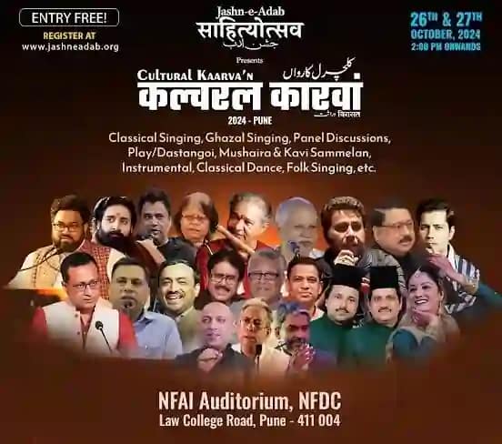 जिंदादिल शहर पुणे (Pune) में भारत के सबसे लोकप्रिय साहित्योत्सव तथा साहित्य और संगीत का महाकुंभ ‘जश्न-ए-अदब कल्चरल कारवां विरासत’ शुरू होने जा रहा है। इस दो दिवसीय महाकुंभ का आयोजन 26 और 27 अक्टूबर, 2024 को नेशनल फिल्म आर्काइव ऑफ इंडिया (एनएफएआई) ऑडिटोरियम, एनएफडीसी, लॉ कॉलेज रोड पर होने जा रहा है।