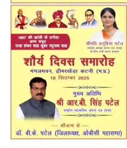 कटनी, 15.9.2025: 1857 की क्रांति के प्रणेता अमर सपूत राजा शंकर शाह और कुँवर रघुनाथ शाह की स्मृति में शौर्य दिवस समारोह और सामाजिक समानता एवं भाईचारा सम्मेलन का आयोजन 18 सितंबर 2025 को मंगल भवन, ढीमरखेड़ा, जिला कटनी में किया जा रहा है। यह आयोजन ऐतिहासिक बलिदान को याद करने और सामाजिक एकता को बढ़ावा देने के उद्देश्य से आयोजित किया जा रहा है।
