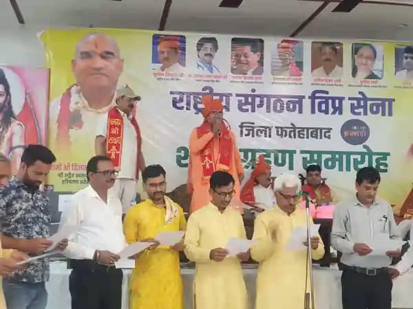 विप्र सेना (Vip Sena) की फतेहाबाद कार्यकारिणी का शपथ ग्रहण समारोह धूमधाम से आयोजित किया गया। कार्यक्रम की अध्यक्षता प्रदेश संरक्षक विज्ञान प्रेमानंद महाराज, सिरसा से प्रदेश संरक्षक पंडित कमल किशोर व प्रदेश अध्यक्ष ललित मोहन शर्मा ने संयुक्त रूप से की। प्रदेश महासचिव हरीश शर्मा ने नवनियुक्त कार्यकारिणी को पटके पहनाकर स्वागत किया। जिला फतेहाबाद में विप्र सेना की कार्यकारिणी को प्रदेश प्रभारी रामानंद शास्त्री ने शपथ दिलवाई। कार्यक्रम में ब्राह्मण समाज की एकता, आगामी लोकसभा व विधानसभा चुनावों में ब्राह्मण समाज की भागीदारी को लेकर, समाज के युवाओं की समस्याओं, आर्थिक स्थिति से कमजोर ब्राह्मण परिवारों को आत्मनिर्भर बनाने हेतु विचार-विमर्श किया गया।