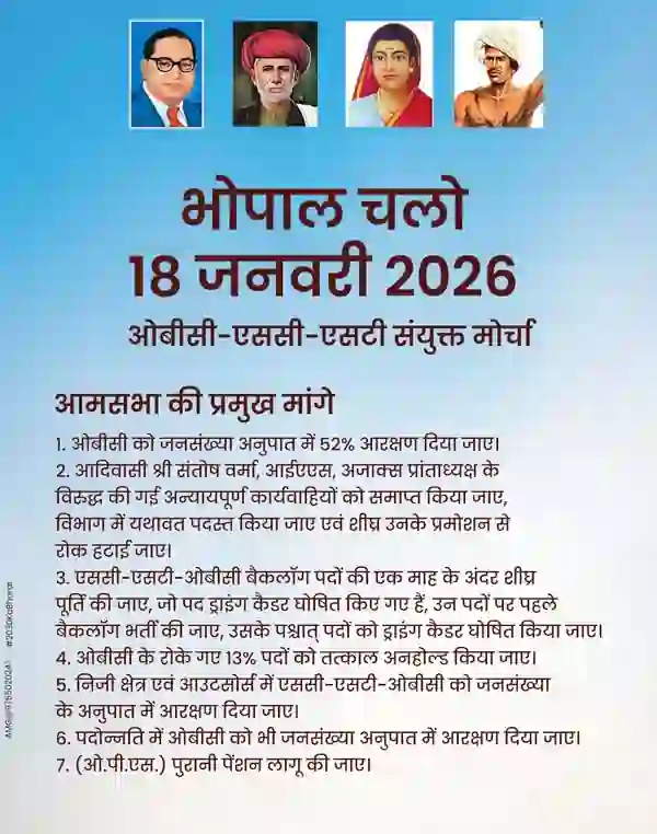 ओबीसी-एससी-एसटी संयुक्त मोर्चा के प्रवक्ता ने कहा, “यह आमसभा सत्ता के खिलाफ नहीं, बल्कि संविधान के पक्ष में है। हम सरकार को याद दिलाना चाहते हैं कि सामाजिक न्याय कोई दया नहीं, बल्कि संवैधानिक अधिकार है। ओबीसी, एससी और एसटी समाज ने लोकतंत्र को मजबूती दी है और अब समय आ गया है कि सरकार भी उनके अधिकारों और सम्मान की रक्षा के लिए ठोस कदम उठाए। 18 जनवरी को भोपाल में उमड़ने वाला जनसैलाब यह स्पष्ट संदेश देगा कि समाज अब चुप नहीं रहेगा।”