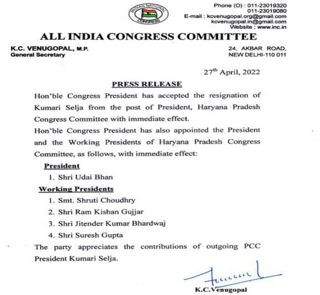 Tags: Haryana CongressHaryana Congress chiefNew Haryana Congress presidentnewspanchkoola-politicsstate