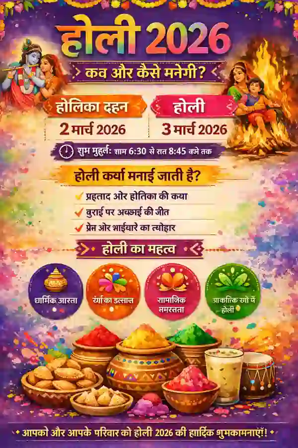 इससे एक दिन पहले यानी 2 मार्च 2026 (सोमवार) को होलिका दहन किया जाएगा।